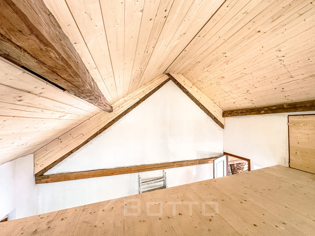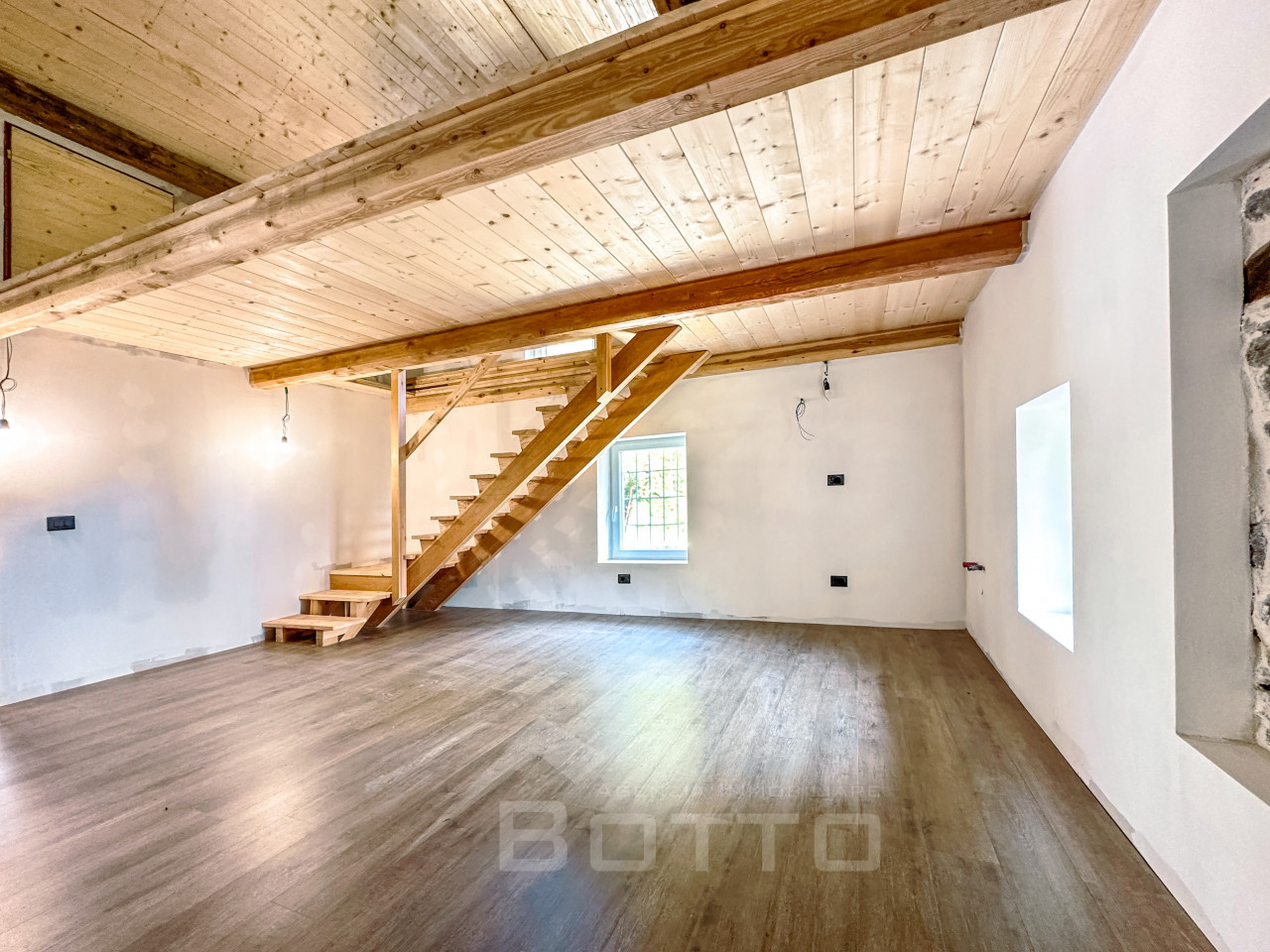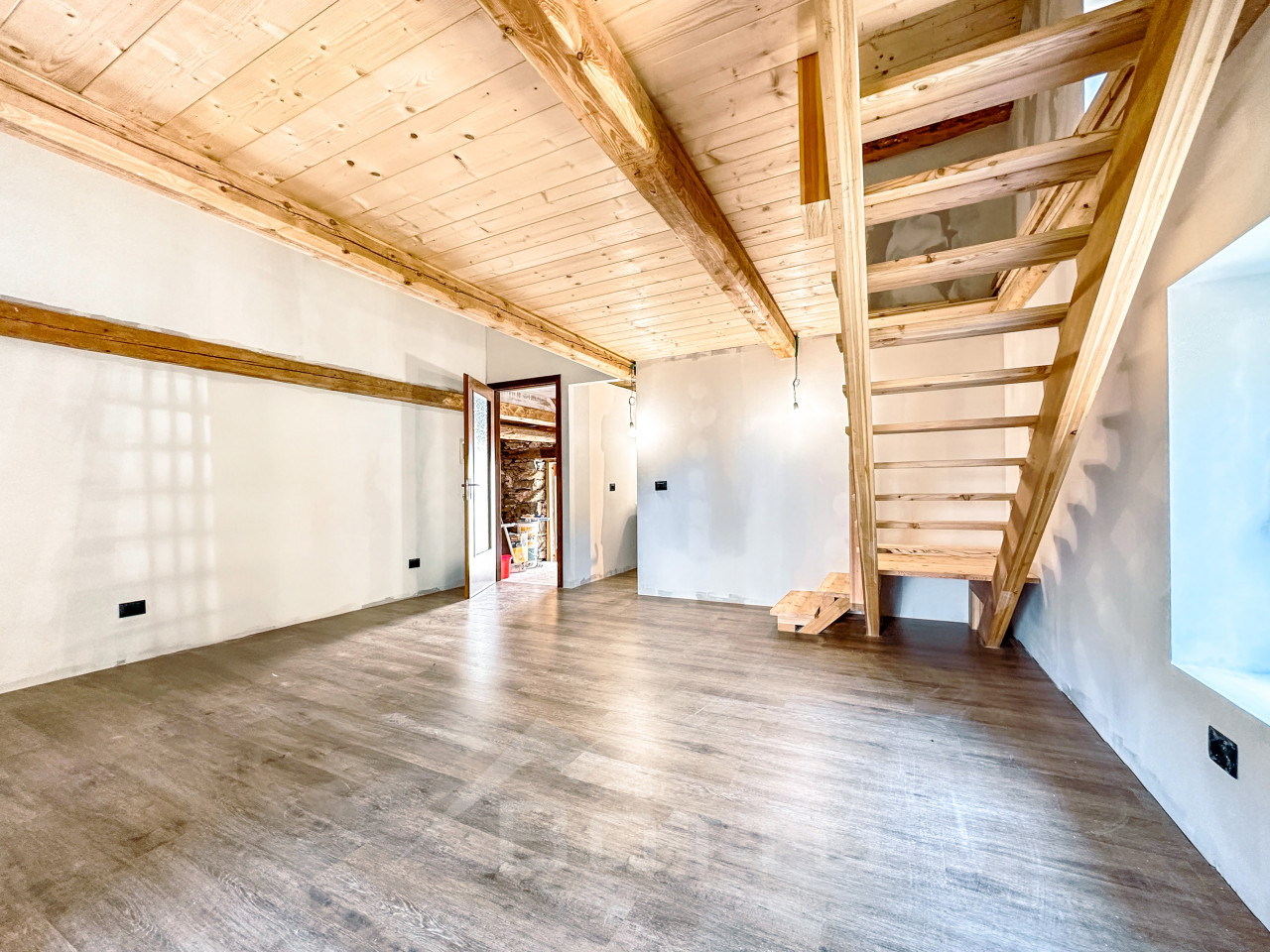 As soon as you enter, you are enveloped in a warm and welcoming atmosphere, made of wood, light and silence. The interiors tell the story of the mountains: exposed beams, natural materials and that unique scent that only well-kept village houses can give back. The living room is an open embrace, with well-distributed spaces and a living area that looks upwards, where the wooden mezzanine adds charm, character and new possibilities: a cozy bedroom, a silent study, a reading corner suspended between dream and reality.