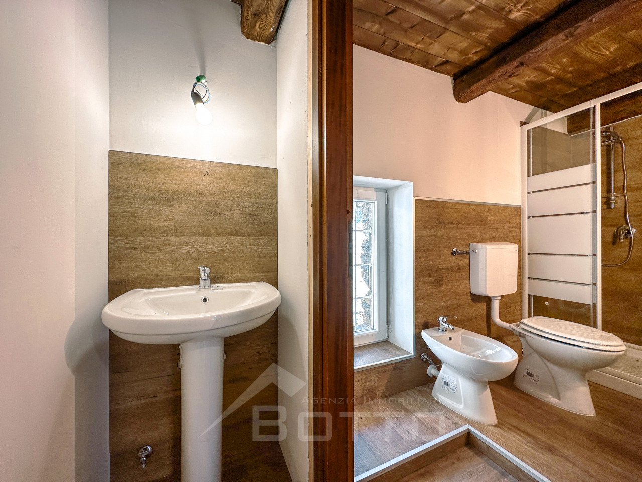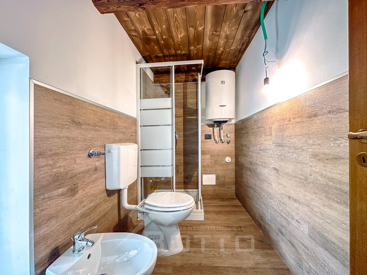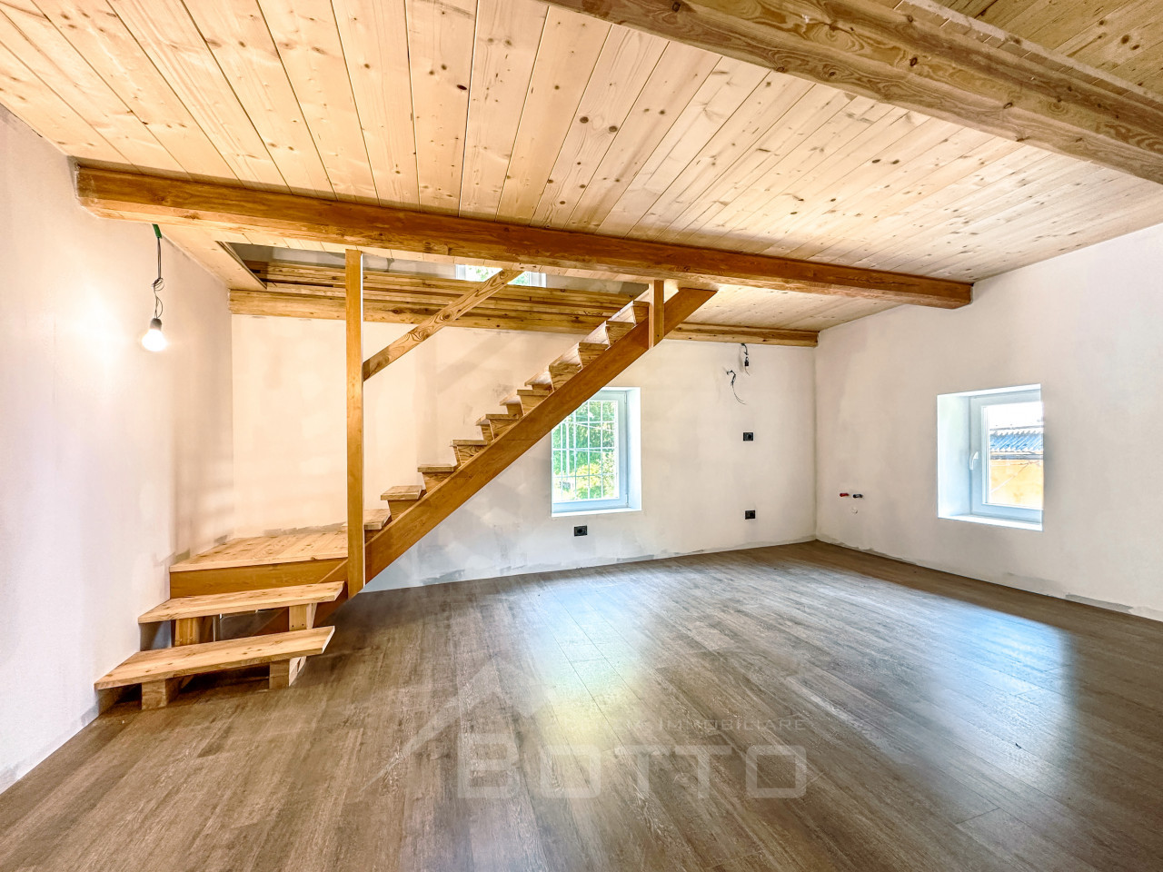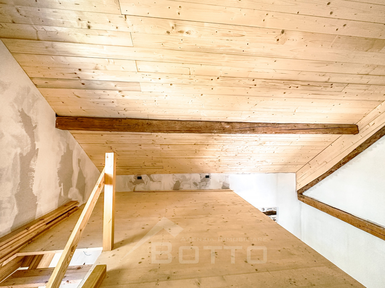 As soon as you enter, you are enveloped in a warm and welcoming atmosphere, made of wood, light and silence. The interiors tell the story of the mountains: exposed beams, natural materials and that unique scent that only well-kept village houses can give back. The living room is an open embrace, with well-distributed spaces and a living area that looks upwards, where the wooden mezzanine adds charm, character and new possibilities: a cozy bedroom, a silent study, a reading corner suspended between dream and reality.